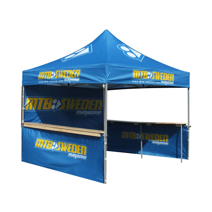 Vid egen design av ditt tält kan det vara bra att tänka på att göra designen så tydlig som möjligt. Gärna så att den fungerar att se på nära håll som långt håll. Ju längre ifrån du kan avläsa designen desto bättre. Håll även din logotyp, budskap och text så långt ifrån skarvar och sömmar som möjligt. Är du osäker på hur du skapar en egen tryckfil så kan du läsa vår guide om tryckfiler. Eller så kan du lägga till produkten hjälp med original i din kundkorg så hjälper vi dig att skapa en tryckfil. Har du andra frågor eller funderingar går det självklart bra att kontakta oss på 0771 – 75 35 00 eller in