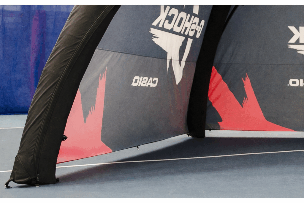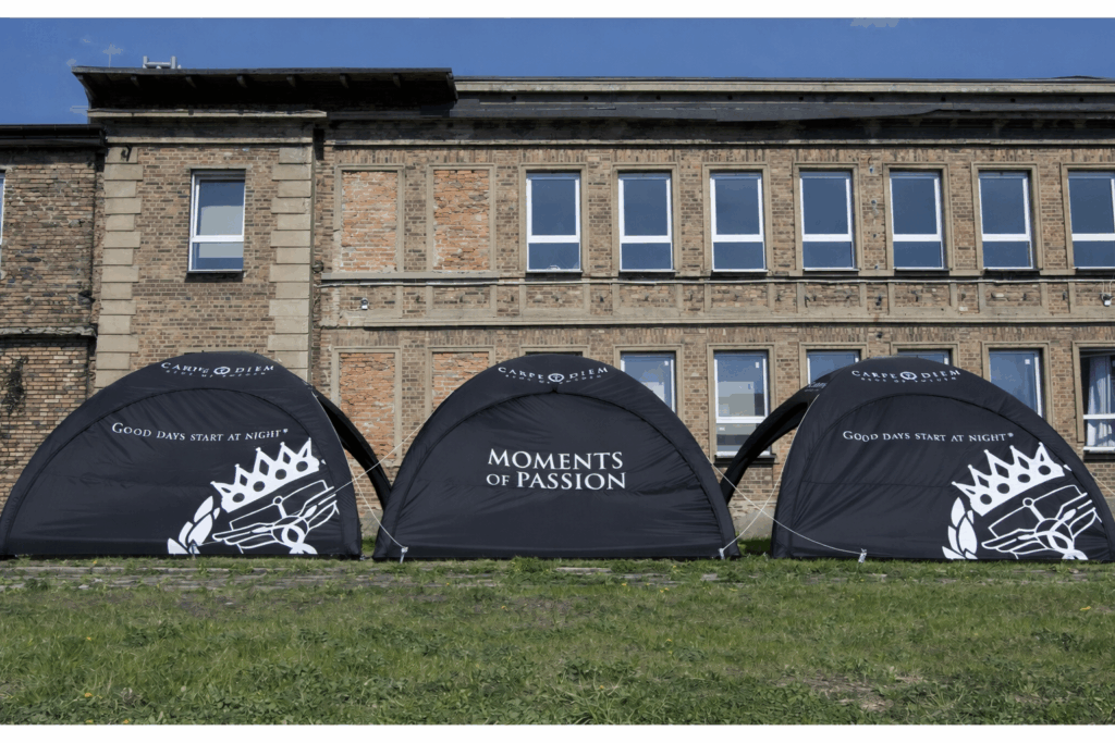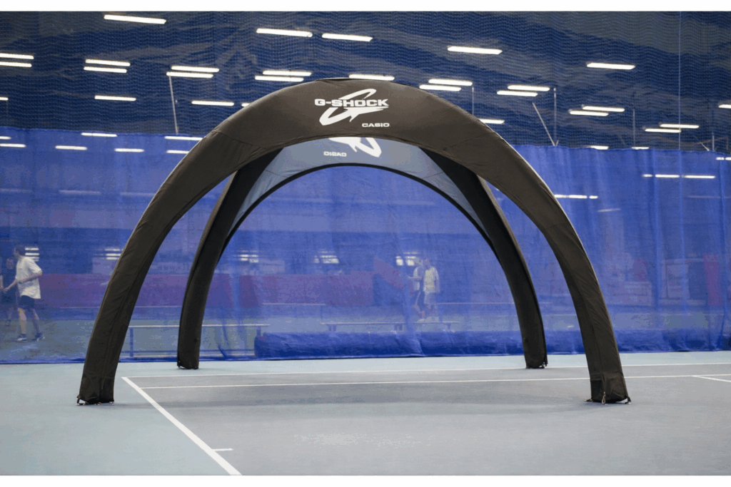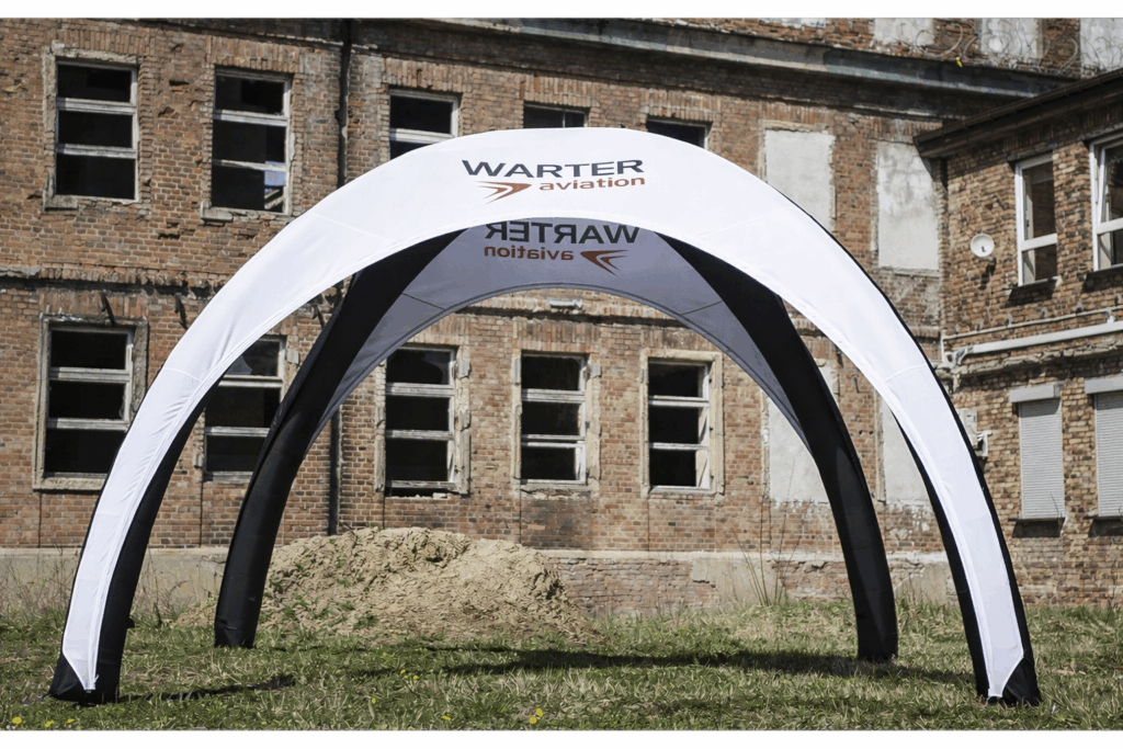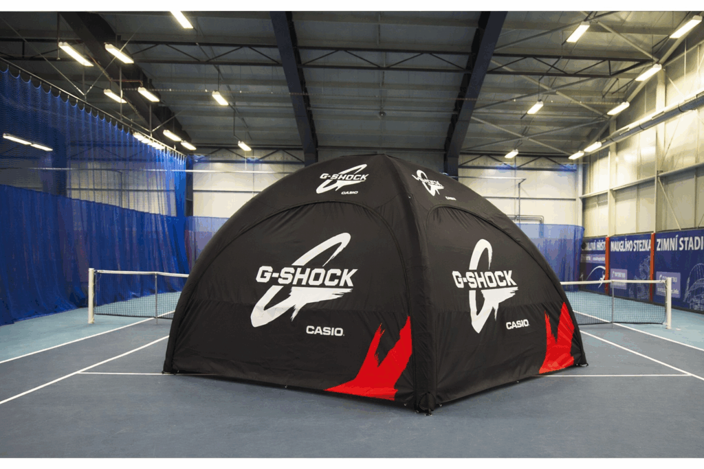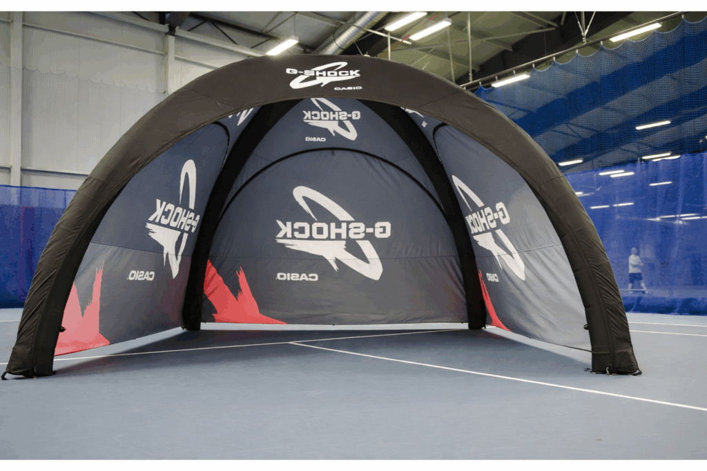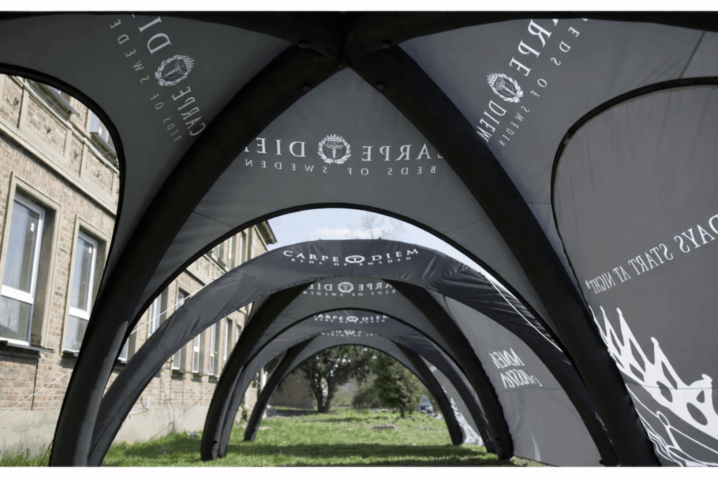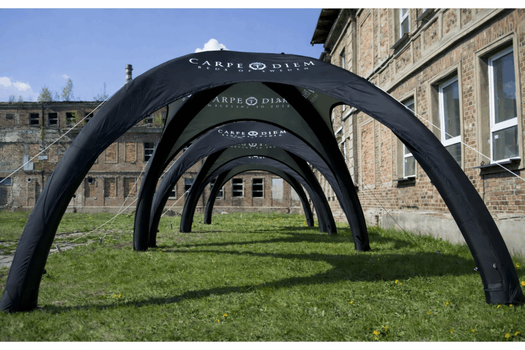 Eftersom tältet inte kräver någon elektricitet eller större montering för att hålla det uppe så passar det utmärkt till event. När du väl blåst upp det har det konstant tryck och du behöver inte tänka på att någon el ska dras till tältet.